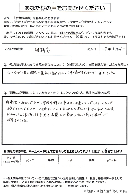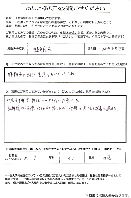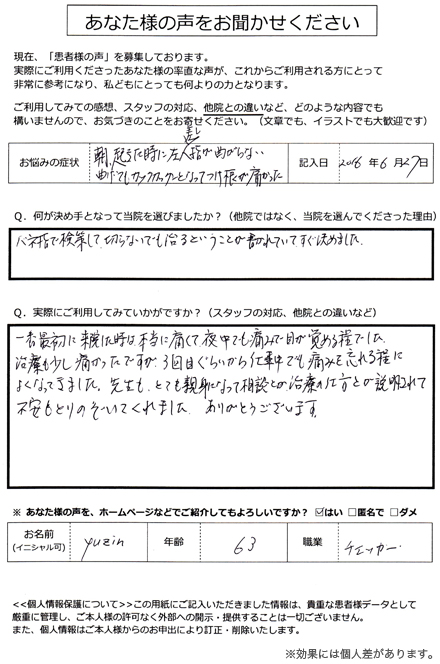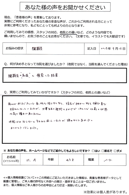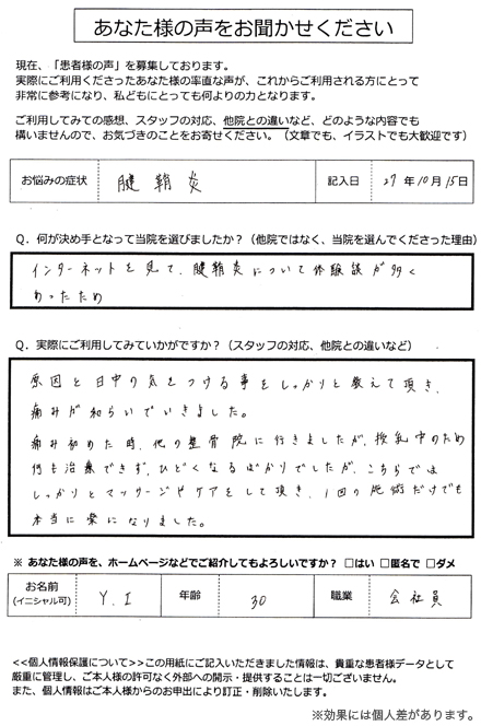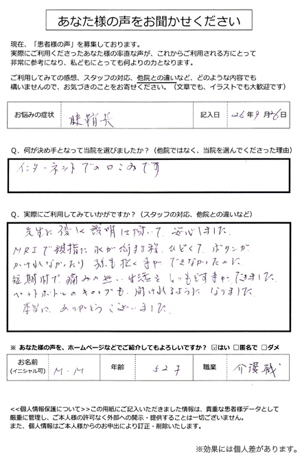 スタッフの方の対応もやさしく本当にありがたかったです。 院長からのコメント 初回来院時は夜中も痛み 汗をふく動作や字を書くのも不自由されてたY様