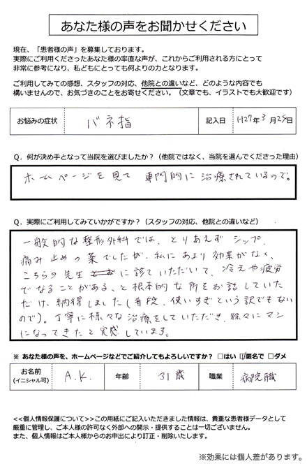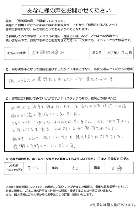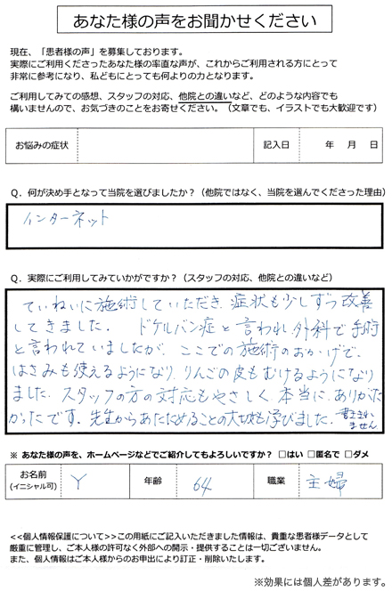 ドケルバン症と言われ外科で手術と言われていましたがここでの施術のおかげで、はさみも使えるようになり、りんごの皮もむけるようになりました。