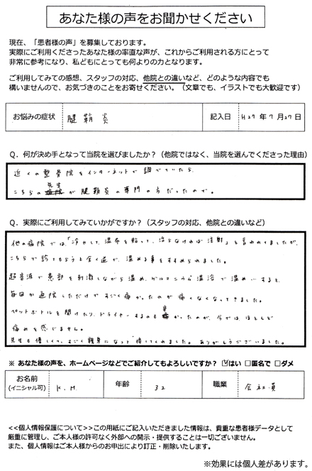 - ●右親指の腱鞘炎 M様 西宮市 26歳 女性