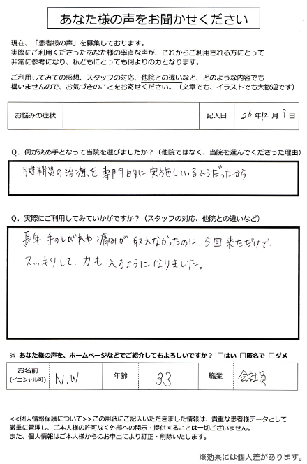 先生に施術して頂き良い結果となったので良かったです。先生ありがとうございました。 院長からのコメント ダンボールを組み立てるお仕事をされてるMN様