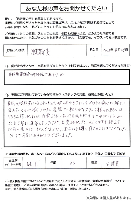 先生もとても親身になって相談とか施術の仕方とか説明されて不安もとりのぞいてくれました。ありがとうございます。 院長からのコメント レジのお仕事をされ重い物を持たれると左人差し指が痛み、普段もペットボトルを開ける時に力が入らないとおっしゃられてたYuzin様