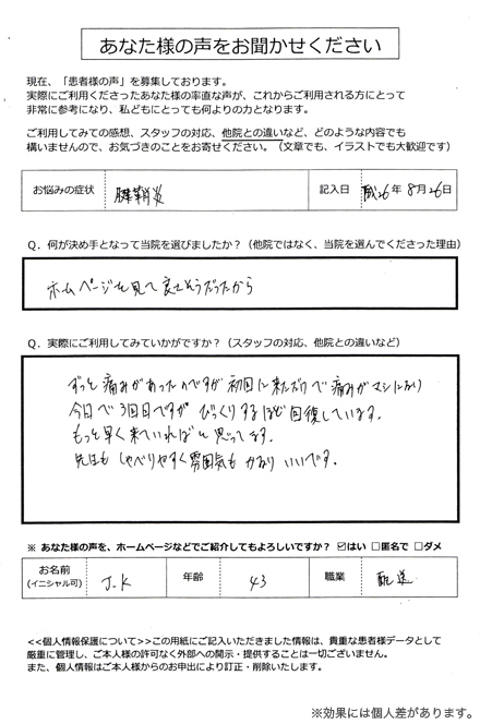 院長からのコメントはじめはペットボトルを開ける動きに痛みを感じるとおっしゃられてましたが、数回でスッキリされ、ほんとうに良かったです。遠方からの通院お手数おかけしました。 |