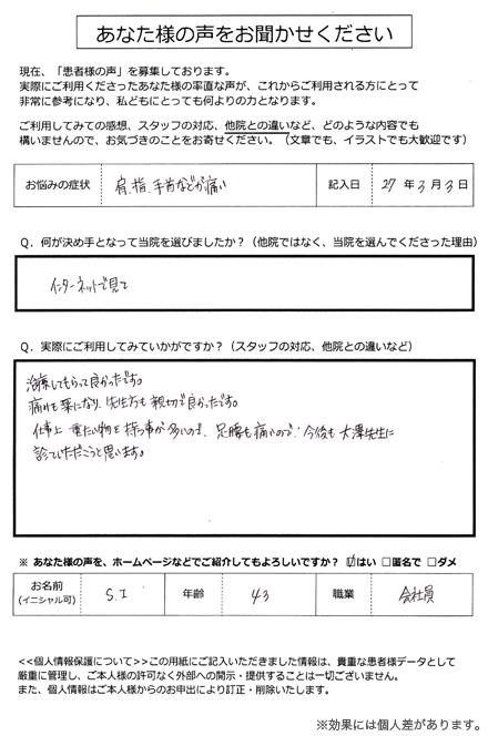 - 仕事中ハサミを使うと痛んでいた。友人の紹介で来院させて頂く。