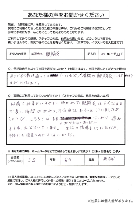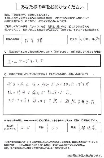 貴院へ通院後、スムーズに動くようになりました。楽に仕事が出来ます。
