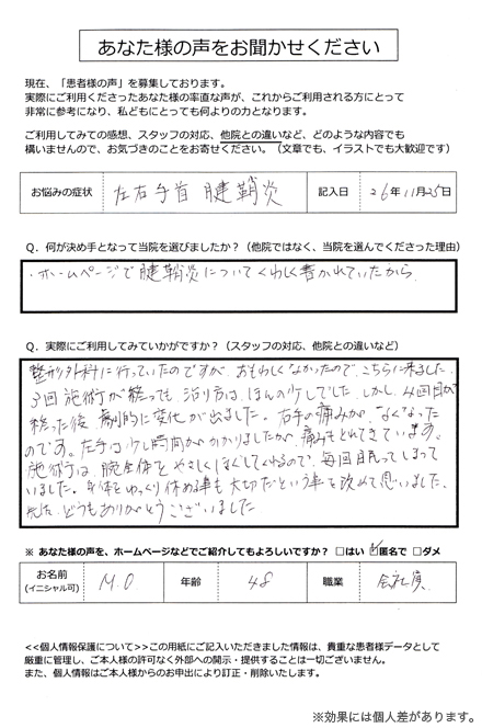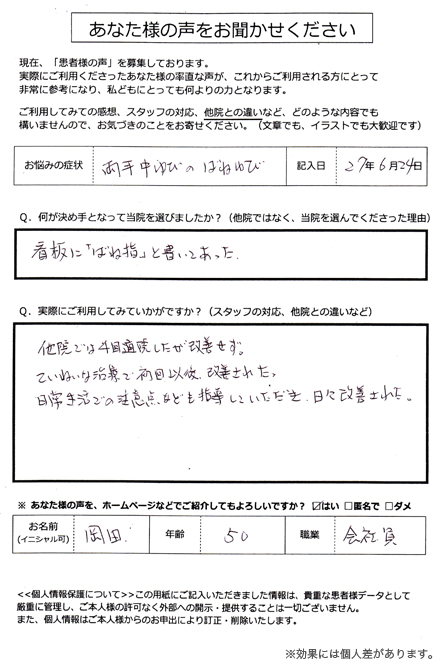 - ●両親指の腱鞘炎 MJ様 尼崎市 37歳 男性 自営業