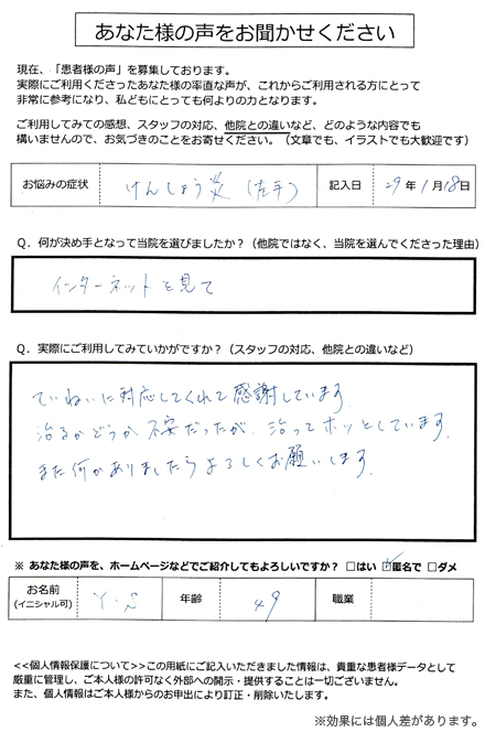 今ではスッキリされ握力も昔の状態にもどり本当に良かったです。 |