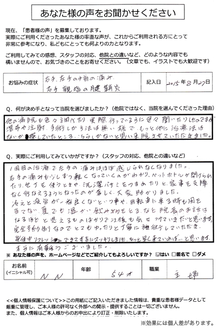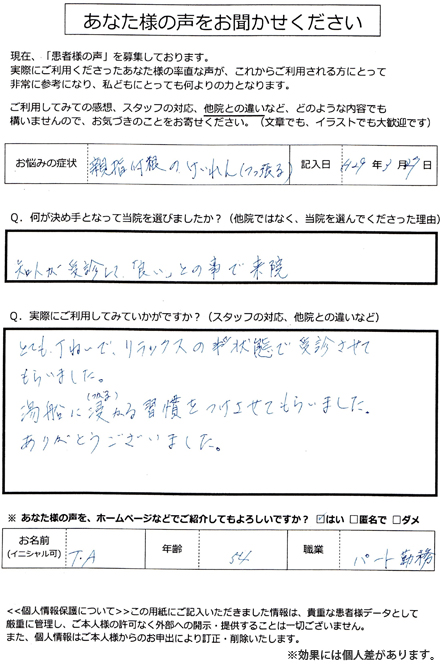 - ●左右両親指の腱鞘炎 T.A様 西宮市 54歳 女性 パート