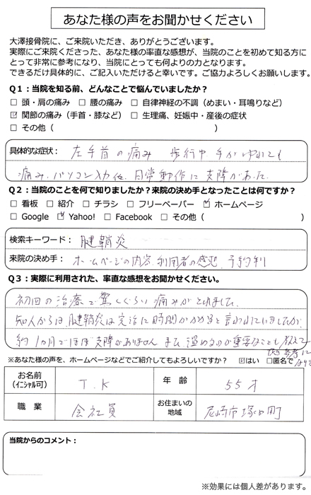 - ●左手首の痛み T.K様 尼崎市 55歳 女性 会社員