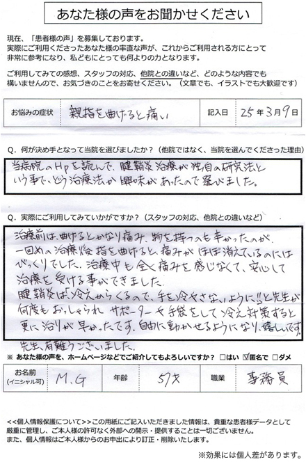 - ●親指を曲げると痛い MG様 57歳 事務員 (尼崎市)