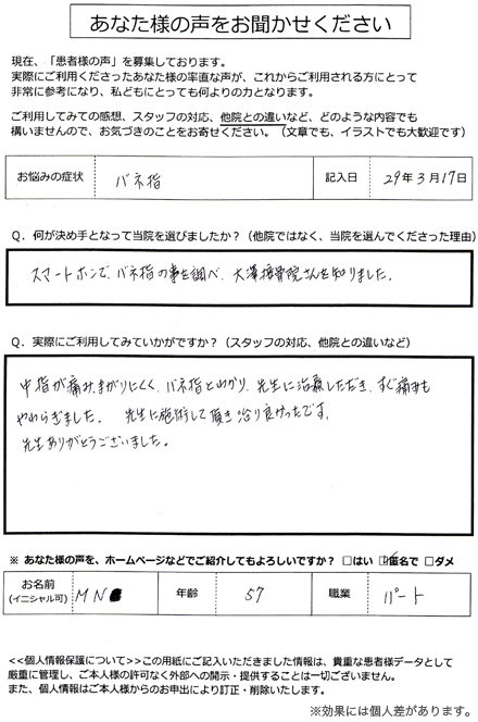 - ●右中指バネ指 MN様 尼崎市 57歳 女性 パート
