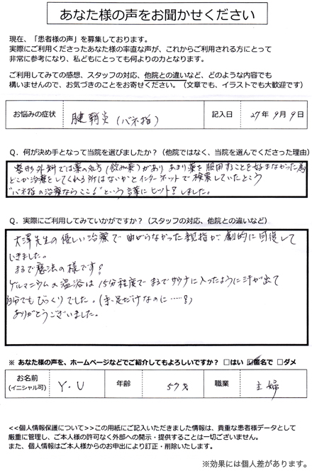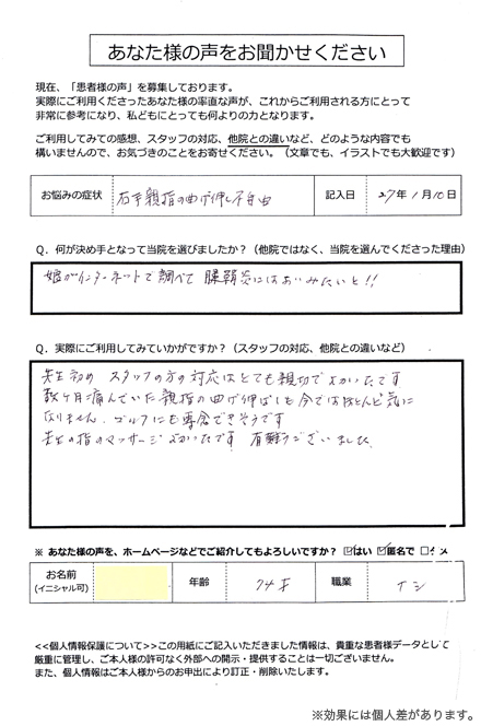 院長からのコメント 半年以上前から親指が痛まれ、ハサミを使う時や爪を切る時不自由されてたYS様。