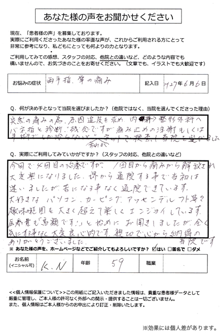 治療前は曲げるとかなり痛み、物を持つのも辛かったのが一回目の治療後、指を曲げると痛みがほぼ消えているのにはびっくりでした。