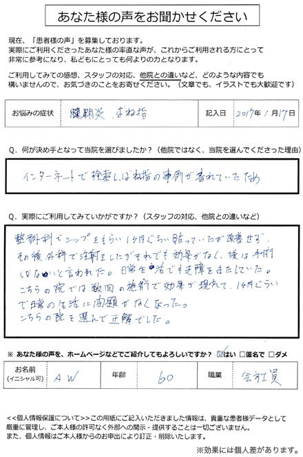 - ●右親指のバネ指 A.W様 尼崎市 60歳 男性会社員