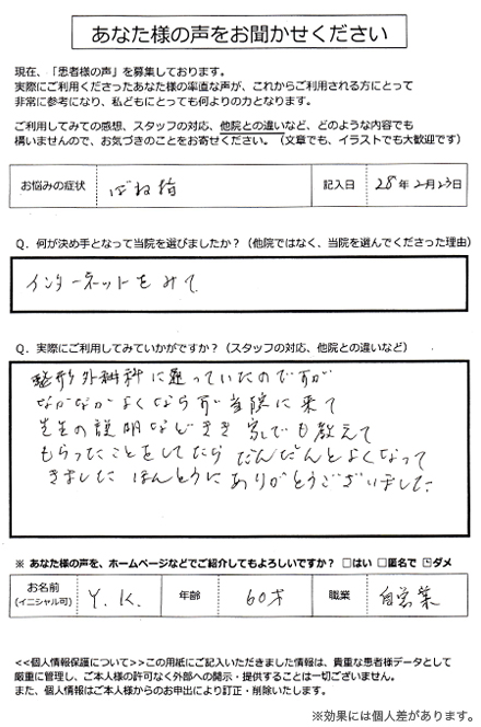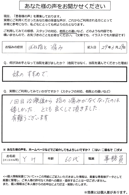 - ●両人差し指バネ指 Y.H様 西淀川区 60代 女性事務員