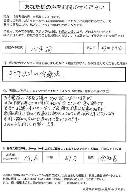 院長からのコメント 強く握る動作 特にペンで書く時に親指の付け根が痛んでいたM.J様