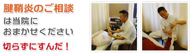 治療は、痛みの程度やバネ指などの障害の程度により異なりますが、当院が数多くの腱鞘炎治療法の中から独自の研究で成果を上げている施術中に痛みを感じない独特の治療法です。ほとんどの腱鞘炎患者さんがたった一回の施術で効果を認める当院ならではの療法です。